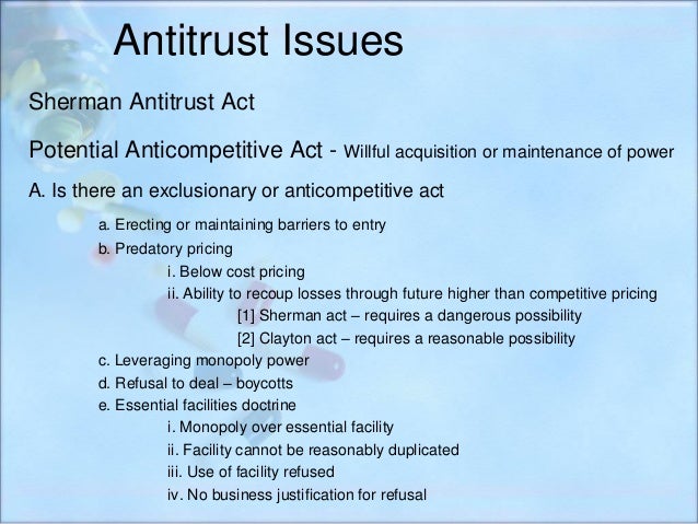 R Bays - Antitrust implications for Healthcare ACO's from image.slidesharecdn.com Its critics pointed out that it failed to define. Congress to prohibit trusts, monopolies, and cartels. A resolution to use a particular means to a. 2 of the act prohibits monopolization or attempts at monopolizing any aspect of interstate trade or commerce and makes the act a a felony. Clayton antitrust act bolsters the sherman act. Sherman antitrust act is federal law that prohibits companies from creating a monopoly. The sherman antitrust act of 1890 was the first measure passed by the u.s. The sherman antitrust act of 1890 was the first measure passed by the u.s.