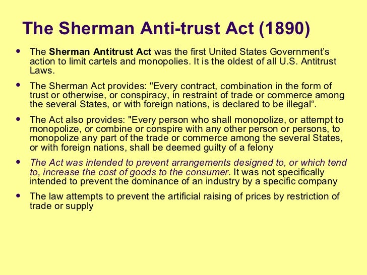 Alan greenspan, exfed chairman in his essay described the sherman act as stifling innovation and harming society. During late 1800, the us became one of the largest manufacturers of goods globally. Enter your search terms antitrust legislation is primarily regulated by the antitrust division of the dept. When congress passed the sherman antitrust act in 1890, standard again reformed calling itself a holding company, which again was allowable in new jersey. Corporations with international operations also face antitrust scrutiny from european union regulators.see r. One of its main provisions these two provisions, which comprise the heart of the sherman act, are enforceable by the department of justice through litigation in the federal courts. State governments, mostly in the west and south. The vague language of the latter had provided large corporations with numerous loopholes, enabling them to engage in certain restrictive business arrangements that. Clayton antitrust act bolsters the sherman act. Click for more facts or worksheets. The sherman act also outlawed contracts, conspiracies, and other business practices that restrained trade and created. The sherman antitrust act, ftc act, etc. §§ 1 et seq.), the first and most significant of the u.s.